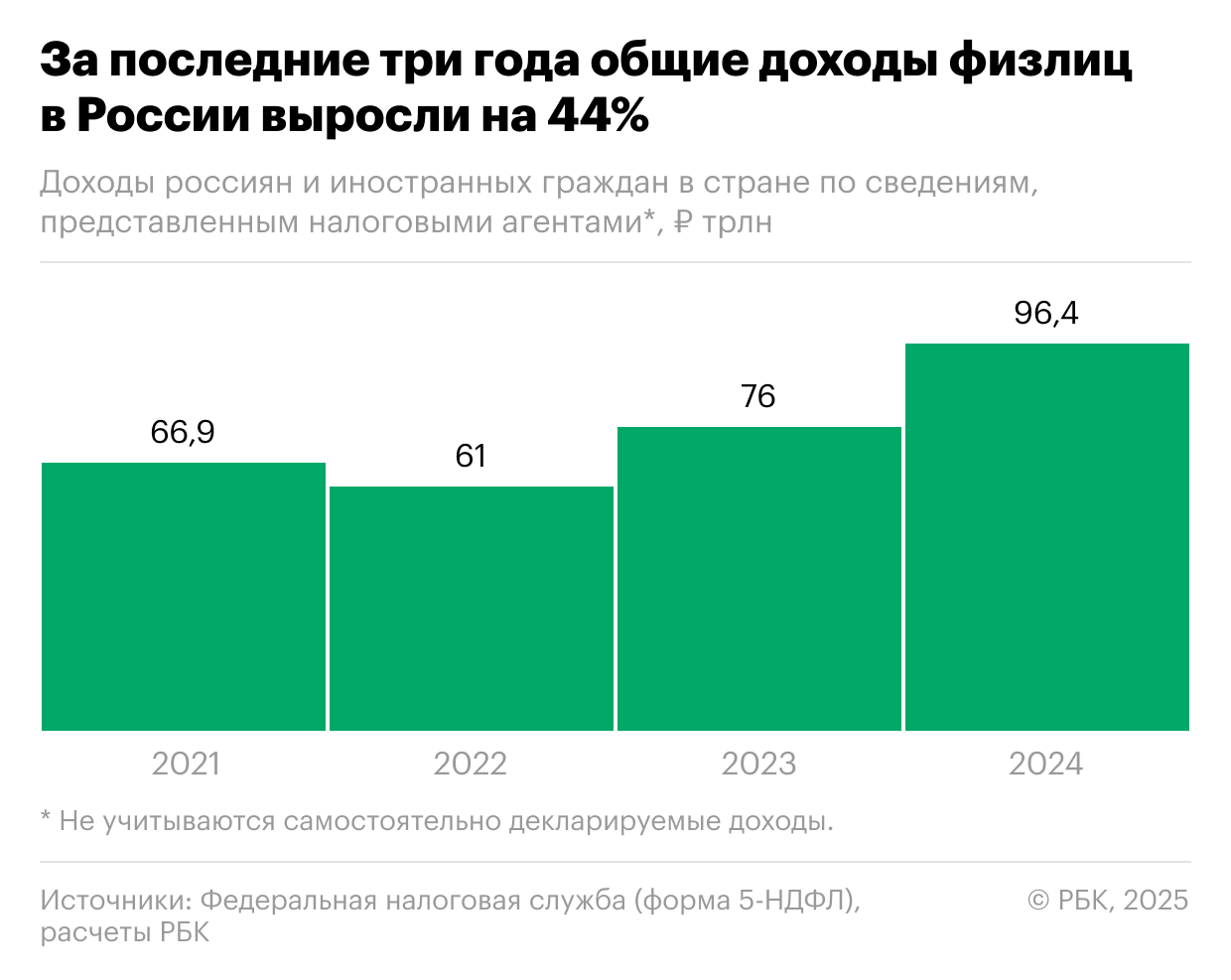 Россияне заработали в 2024 году 96,4 трлн руб., следует из данных Федеральной налоговой службы, которую РБК проанализировал с экспертами. Рост общей суммы доходов составил 27% по сравнению с 2023 годом.