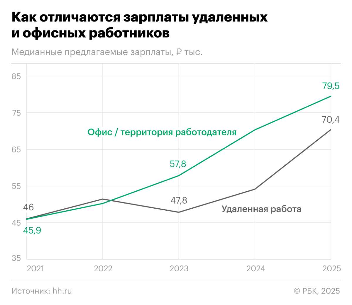 Так, во время действия коронавирусных ограничений, в 2021 году, на удаленке сотрудникам предлагали зарплату чуть выше — 46 тыс. против 45,9 тыс. руб. в офисе. Ситуация поменялась в 2022 году, когда в офисе стали предлагать зарплату выше. К 2023 году разрыв увеличился значительно — в офисе стали предлагать 57,8 тыс. против 47,8 тыс. руб. на удаленке. Позже этот разрыв стал сокращаться — если в 2023 году он составлял 10 тыс. руб., то к 2025 году — 9,1 тыс. руб. (79,5 тыс. руб. в офисе против 70,4 тыс. руб. на удаленке).
