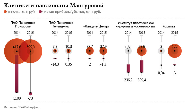Бизнес-интересы Мантуровой связаны и с Геленджиком, где расположен пансионат «Приморье», который специализируется на косметологии и пластической хирургии, а также послеоперационной реабилитации. Из материалов арбитражных дел следует, что пансионат принадлежит ПАО «Пансионат «Приморье», в совет директоров которого, по данным «СПАРК-Итерфакс», входила Наталья Мантурова. Услуги на сайте пансионата — от эндоскопического омоложения лица до интимной пластики — анонсирует сама Мантурова.