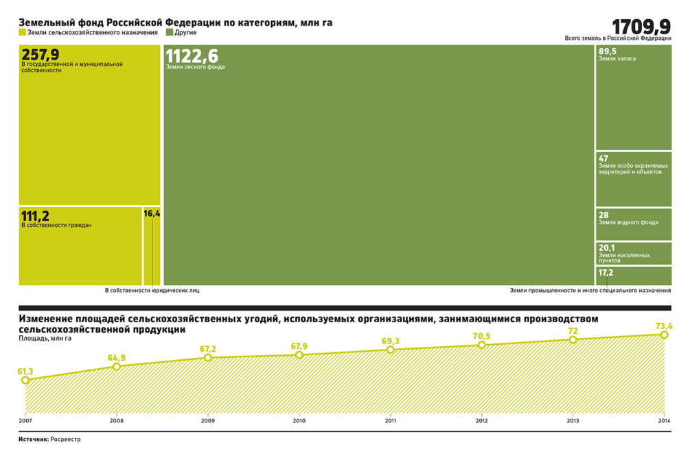 По состоянию на 1 января 2015 года в России насчитывалось 385,5 млн га земель сельхозназначения — это 22,5% от всех земель в стране. По данным одного из инициаторов проекта, депутата Айрата Хайруллина, после ужесточения законодательства может высвободиться 12–18 млн га.