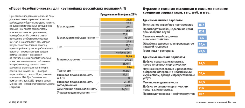 При отмене порогов и снижении общей ставки компании с «дорогими» сотрудниками будут отдавать во внебюджетные фонды больше, а компании, которые платят меньшие зарплаты, смогут экономить. «Финансовый сектор вынужден будет расплатиться [за другие отрасли]: за счет высоких заработных плат — повысится его нагрузка. Нефтяники тоже пострадают от этого», — рассуждает директор Института труда и страхования РАНХиГС Александр Сафонов. Источник РБК в «Деловой России» говорит, что в числе пострадавших могут оказаться отрасли глубокой переработки, хотя именно они призваны помочь отойти от сырьевой модели экономики. По расчетам одной из крупнейших компаний нефтехимического сектора, при реализации предложения Минфина ее расходы увеличатся на 3 млрд руб. в год, утверждает собеседник РБК.