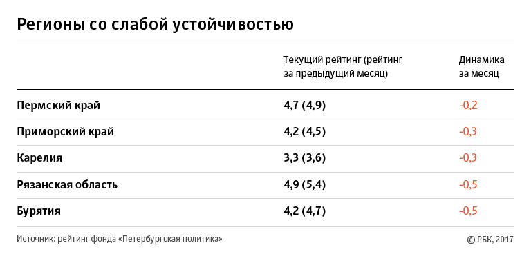 В целом пять из десяти регионов, где недавно произошла смена губернаторов, эксперты назвали территориями со слабой устойчивостью (Кировскую и Рязанскую области, Пермский край, Бурятию и Карелию). Еще в трех регионах политическая и социально-экономическая устойчивость оценивается как пониженная (Ярославская, Калининградская и Новгородская области). Адыгею политологи посчитали регионом с высокой устойчивостью. Севастополь не был включен в рейтинг.