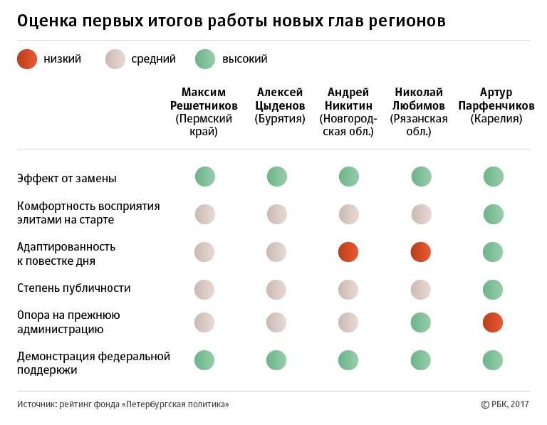 По данным политологов, все новые главы регионов — кроме врио губернатора Адыгеи Мурата Кумпилова — получают серьезную поддержку от федерального центра (для семерых из них политологи в докладе оценили ее как «высокую») и активно выступают в федеральных СМИ. Правда, и то и другое связано с «новоназначенностью» политиков на постах, рассказал РБК глава «Петербургской политики» Михаил Виноградов. «Есть настрой на большую публичность, что вполне естественно — до выборов мало времени (а известность накапливается в сегодняшних российских реалиях очень медленно)», — пояснил политолог.