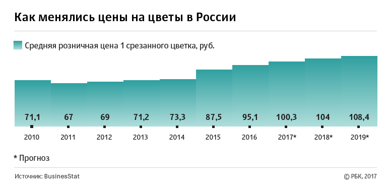 Эксперты полагают, что, несмотря на снижение рентабельности, продажи цветов в России в среднесрочной перспективе будут расти. Аналитики BusinesStat предсказывают, что к 2019 году они достигнут 2,16 млрд штук (+23,1% к 2014 году). Драйверами роста в BusinesStat называют развитие сегмента флористических услуг в стране, а также смену потребительских привычек: если раньше цветы приобретались исключительно по праздникам, то теперь их чаще покупают без привязки к дате, а в знак внимания и расположения.