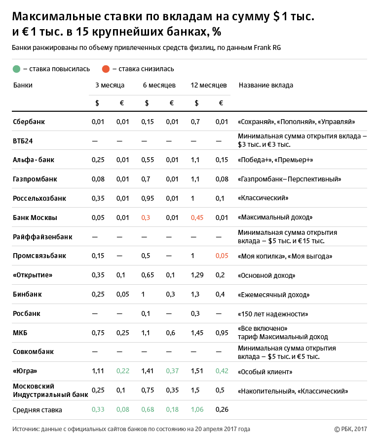В апреле ставки по валютным депозитам изменились в трех банках из 15 крупнейших по объему привлеченных средств. Банк Москвы понизил ставки по долларовым депозитам на срок шесть и 12 месяцев, а Промсвязьбанк уменьшил ставку по депозитам в евро на 12 месяцев. Банк «Югра», напротив, увеличил ставки по депозитам в евро на три и шесть месяцев, а также предложил новые вклады в долларах, которые тоже вошли в выборку РБК. За счет этого средние ставки по долларовым депозитам среди банков топ-15 в апреле немного повысились.