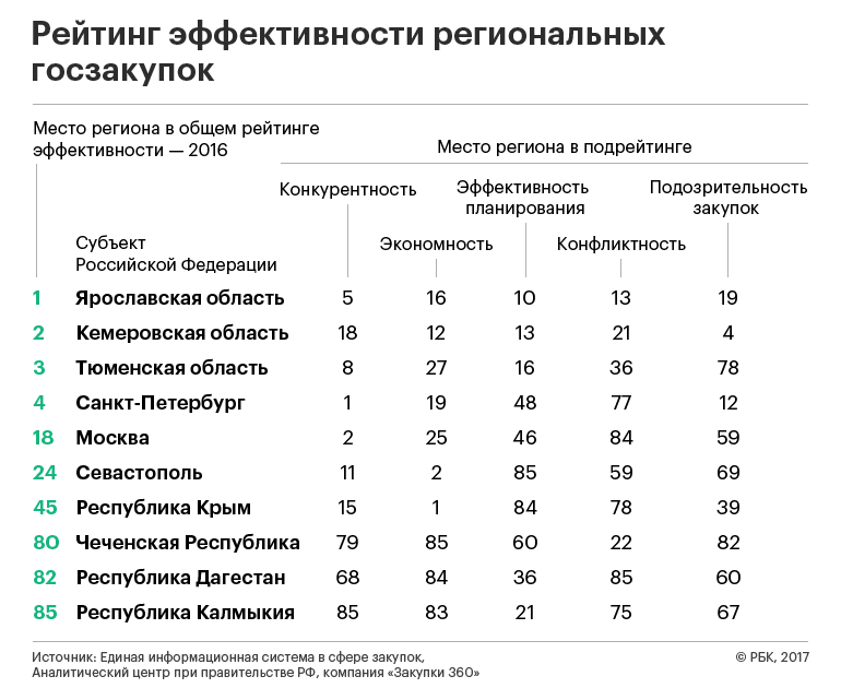 В целом самыми эффективными регионами в разрезе госзакупок стали Ярославская, Кемеровская и Тюменская области. Последнее место заняла Калмыкия (см. таблицу).