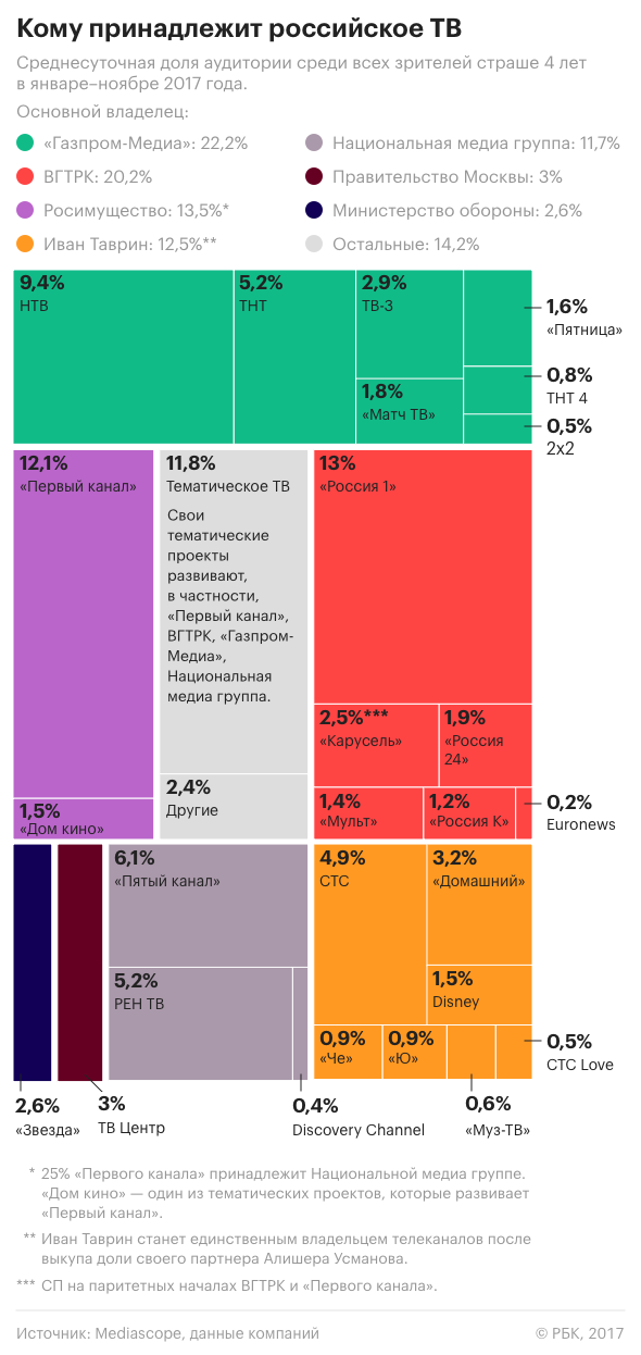 Для сравнения, в 2011 году структуры, связанные с банком «Россия» Юрия Ковальчука, выкупили у «Альфа-Групп» 25,17% «СТС Медиа» за $1,072 млрд (29,9 млрд руб. по курсу ЦБ на тот период). Таким образом, весь холдинг «СТС Медиа» был оценен почти в $4,3 млрд (118,8 млрд руб.). Сейчас 25% «СТС Медиа» через кипрскую Telcrest Investments Ltd владеют структуры ВТБ, Алексея Мордашова, банка «Россия», «Сургутнефтегаза» и Национальной медиа группы.