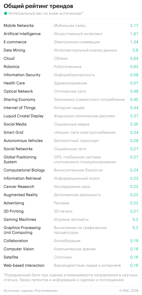 В исследовании «Ростелекома» также приведен рейтинг глобальных трендов цифровизации. Наиболее важными направлениями компания назвала мобильную связь, искусственный интеллект и электронную коммерцию. Рейтинг составлялся на основе анализа 6 млн научных публикаций, патентов, сделок слияния и поглощения, а также публикаций в специализированных изданиях, который проводился с помощью алгоритма машинного обучения, разработанного «дочкой» «Ростелекома» компанией «Айкумен — информационные бизнес-системы».