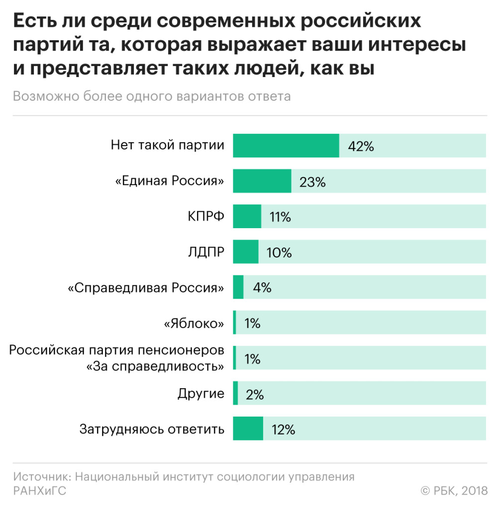 Менее четверти респондентов называют представителем своих интересов «Единую Россию» (23%), далее идут КПРФ (11%), ЛДПР (10%) и «Справедливая Россия» (4%).