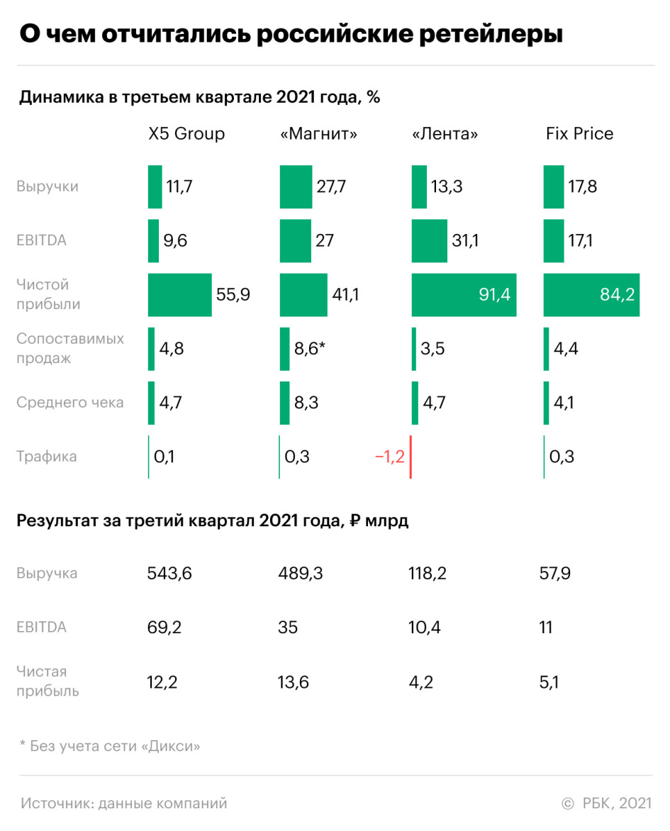 На неделе по итогам третьего квартала отчитались сразу несколько российских ретейлеров: X5 Group (FIVE; сети «Пятерочка», «Перекресток», «Карусель»), «Магнит» (MGNT), «Лента» (LNTA) и Fix Price (FIXP).