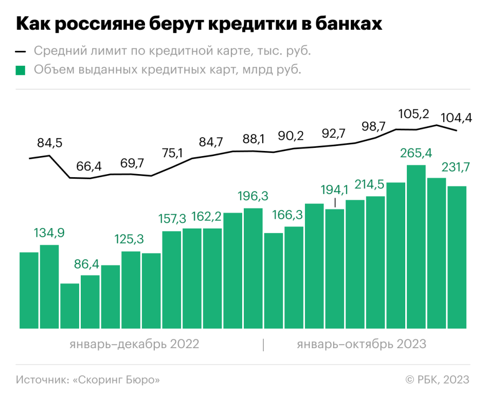 В октябре 2023 года средний лимит по выданным кредитным картам составил 104,4 тыс. руб., сократившись за месяц на 4,3 тыс. руб., или на 4%, следует из статистики бюро кредитных историй «Скоринг Бюро» (есть у РБК). Это самое заметное падение показателя с марта кризисного 2022 года — тогда средний чек в сегменте кредиток «просел» на 20,9%, до 66,8 тыс. руб. После пика кризиса рынок кредитных карт восстанавливался быстрыми темпами и уже к концу года стал обновлять рекорды. На этом фоне практически непрерывно рос и средний лимит по кредиткам — летом этого года он приблизился к 100 тыс. руб., а потом преодолел этот уровень.