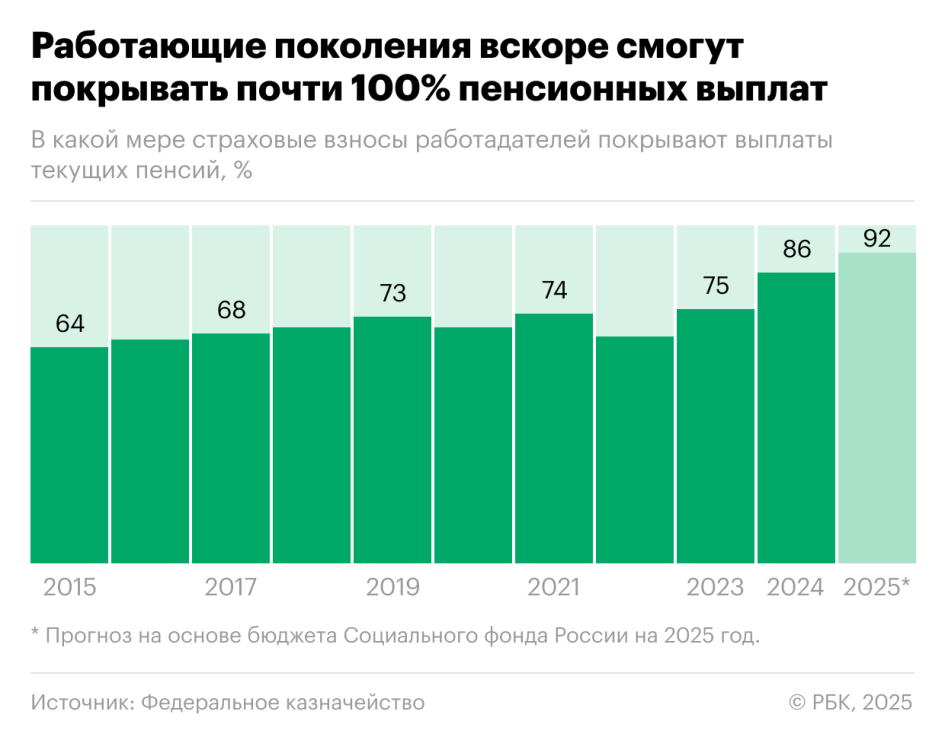 В 2025 году коэффициент может возрасти до 92% (прогнозируемые взносы на обязательное пенсионное страхование — 10,05 трлн руб., расходы на выплату страховой пенсии — 10,94 трлн руб.), следовало из осеннего проекта бюджета Соцфонда. РБК направил запрос в Минтруд.