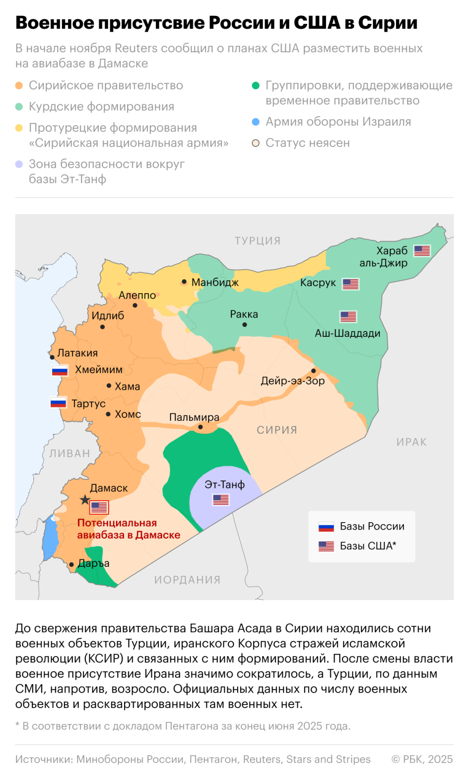Весной этого года США начали поэтапное сокращение и консолидацию сил действующей в Сирии международной коалиции, в которую входят почти девять десятков стран. В докладе генерального инспектора Пентагона за второй квартал 2025 года сообщается, что американские военные покинули три военные базы: Mission Support Site Green Village, Mission Support Site Euphrates и H2. «Военнослужащие США и коалиции либо были передислоцированы на другие базы Совместной объединенной оперативной группы (координационный орган коалиции по борьбе с ИГ, операция «Непоколебимая решимость». — РБК) в Сирии или Ираке, либо вернулись в Соединенные Штаты после завершения срока своей службы», — говорится в документе.