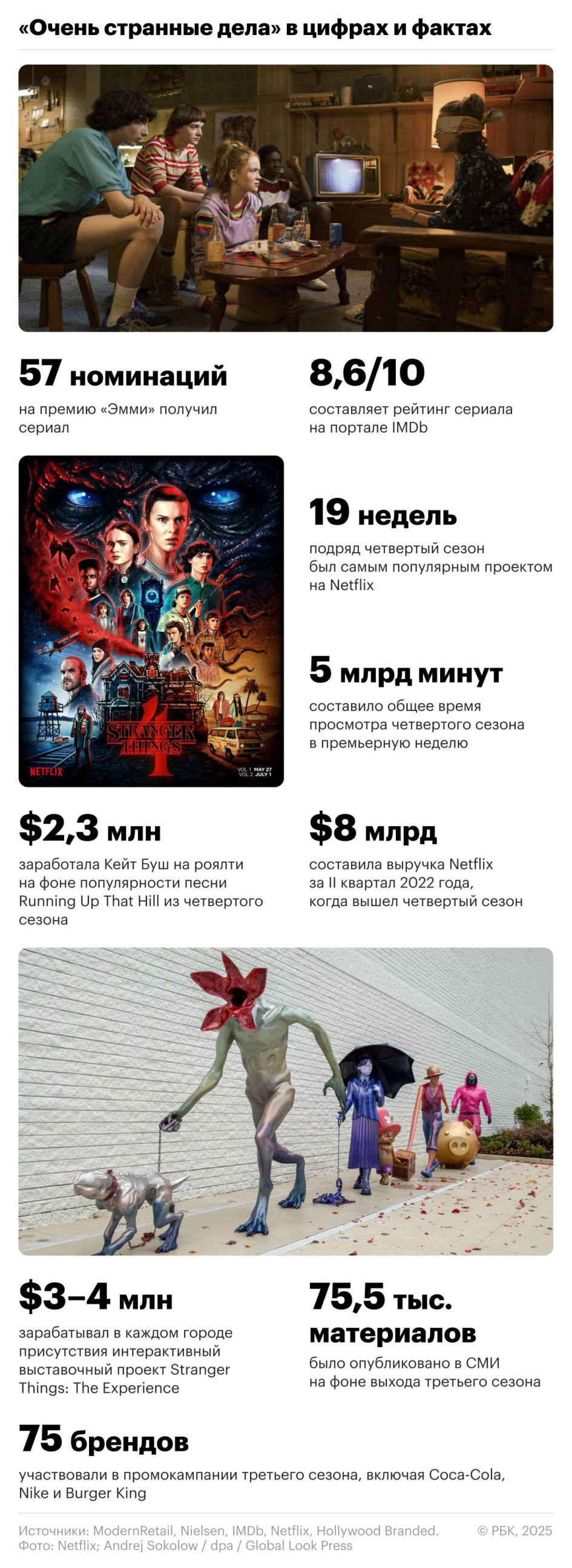 Сколько стоит франшиза «Очень странных дел», кто на ней зарабатывает и почему создателям удалось сделать популярным проект, построенный на ностальгии, — в обзоре РБК.