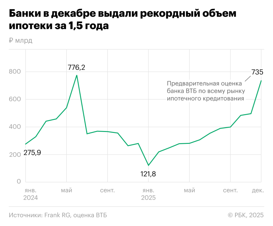 Если опираться на данные консалтинговой компании Frank RG за предыдущие месяцы и оценку ВТБ, то продажи ипотеки в декабре могут считаться самыми значительными за полтора года. Предыдущий рекорд — выдачи в объеме 776,2 млрд руб. — был достигнут в июне 2024 года, последний месяц действия массовой льготной ипотеки на новостройки под 8% и программы семейной ипотеки на более мягких условиях.