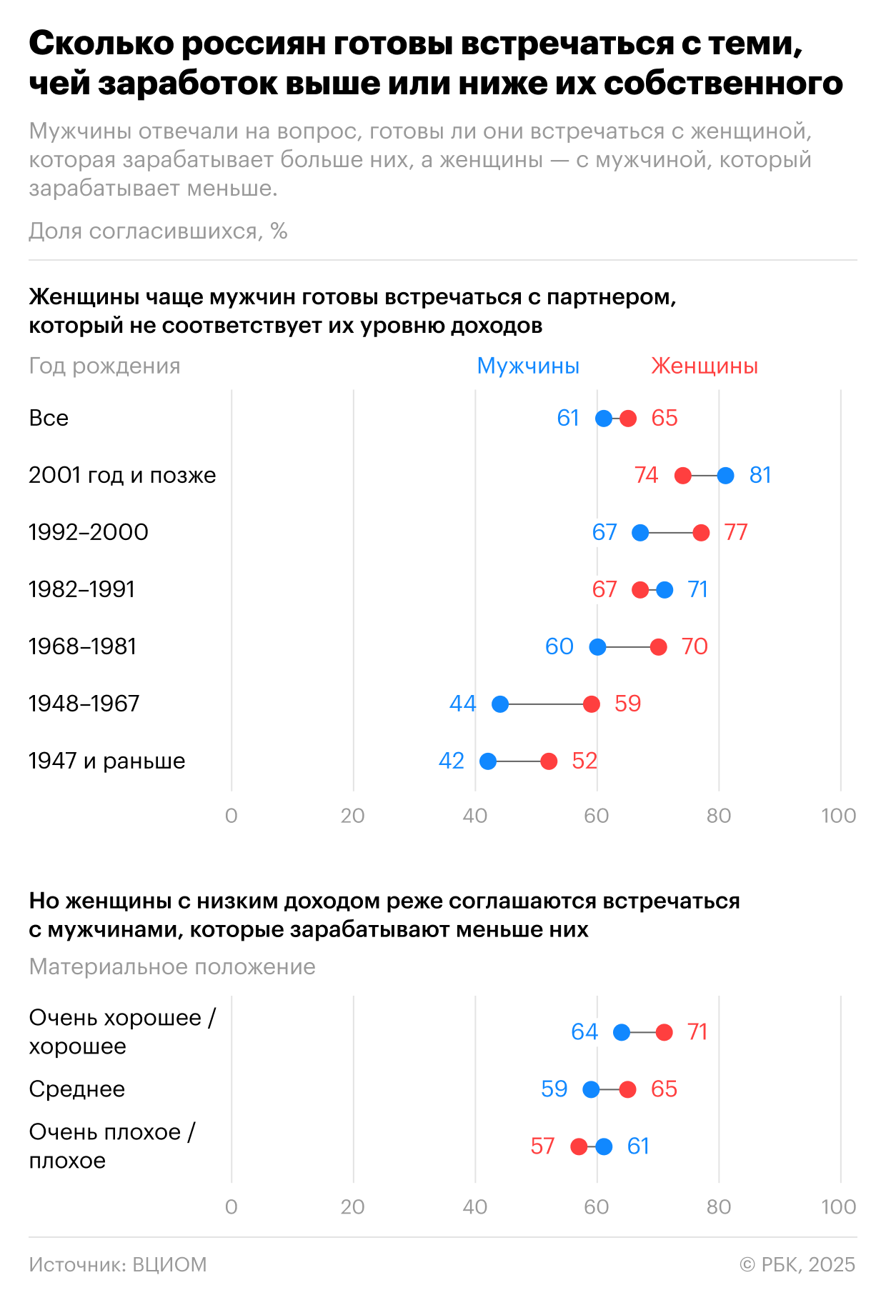 Объясняя такую установку, женщины чаще всего говорили, что «деньги не главное» (26%), а также вспоминали «любовь» (19%). Не готовы начать отношения с мужчиной беднее себя 18% женщин. Они говорили, что «мужчина должен зарабатывать» (30%), боялись, что доходов «не будет хватать на жизнь» (28%).