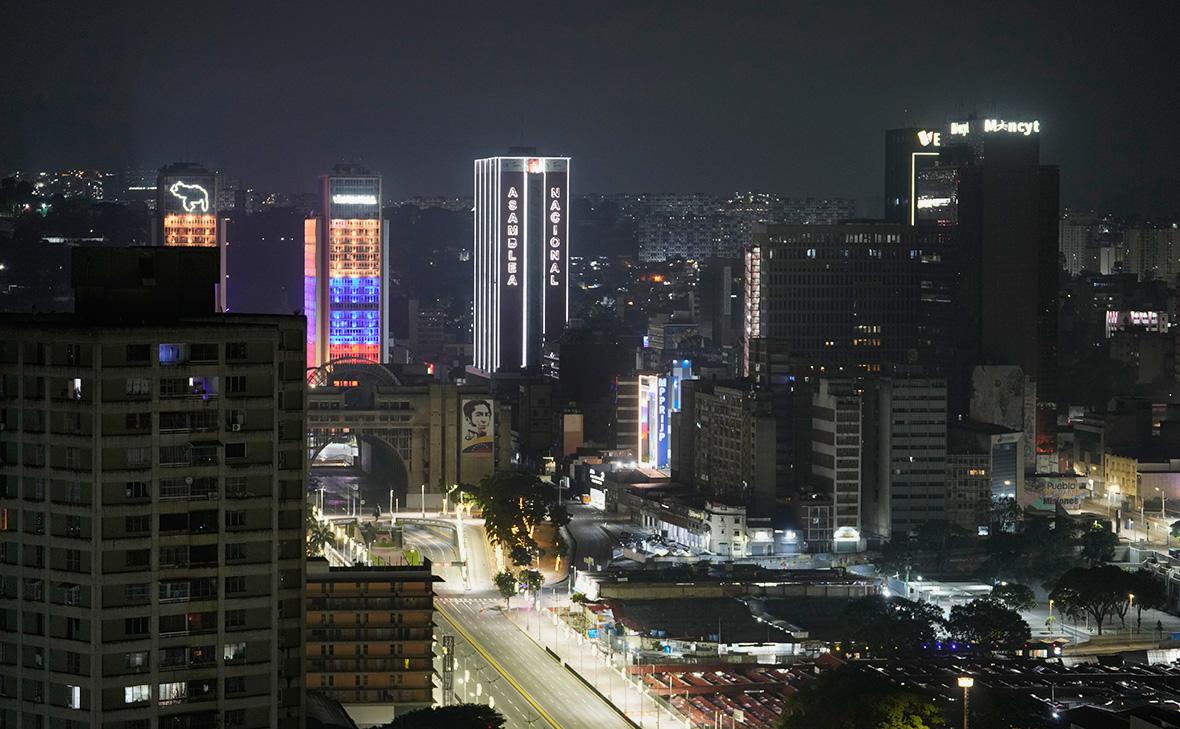 Здание Национальной ассамблеи в центре Каракаса (Венесуэла) освещено после взрывов и пролётов низколетящих самолётов