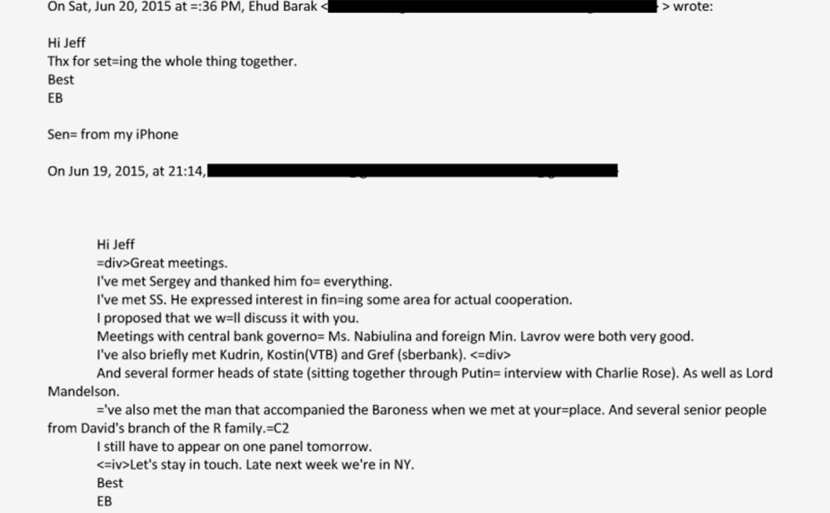 Речь идет об электронном сообщении, которое Эпштейн получил от Барака 20 июня 2015 года. На тот момент он уже ушел из политики. В нем Барак рассказывает финансисту об «очень хороших встречах» с главой ЦБ Эльвирой Набиуллиной, министром иностранных дел Сергеем Лавровым и другими официальными лицами из России.