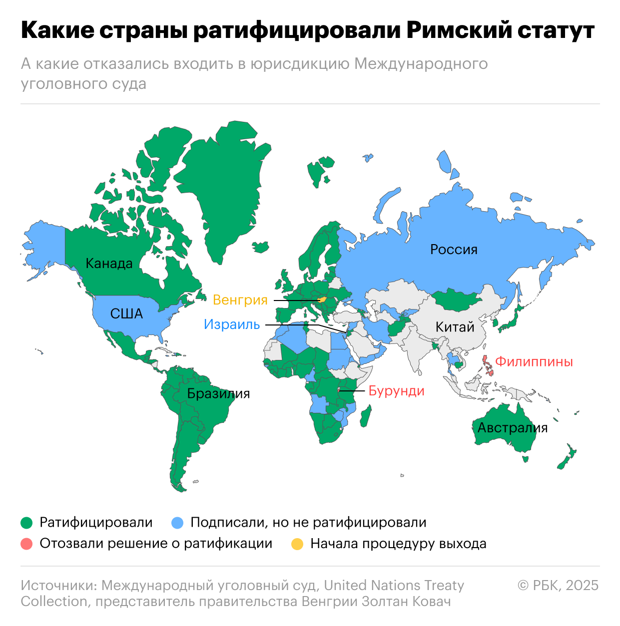 Последней страной, ратифицировавшей Римский статут, стала Украина. Президент Украины Владимир Зеленский подписал законопроект о ратификации в августе 2024 года; страна стала участницей 1 января 2025-го. До этого, в марте 2023 года, МУС выдал ордер на арест президента России Владимира Путина. В Кремле решение сочли «с точки зрения права ничтожным», а саму постановку вопроса — «возмутительной и неприемлемой». Россия находится в числе 29 стран, которые подписали, но не ратифицировали Римский статут, поэтому под юрисдикцию суда не подпадает.