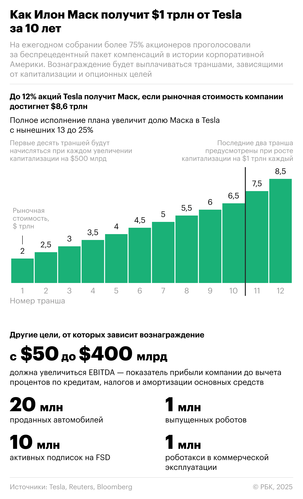 В случае выполнения этих условий Маск не только будет контролировать около 25% акций Tesla, но и сможет стать первым в истории триллионером. И без бонуса его состояние насчитывает порядка $500 млрд.