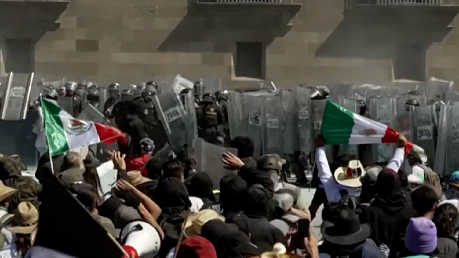 В Мехико небольшая группа протестующих в капюшонах снесла ограждения вокруг Национального дворца, где проживает президент Клаудия Шейнбаум, что спровоцировало столкновения с полицией по борьбе с беспорядками, которая применила слезоточивый газ, сообщают очевидцы агентства Reuters.