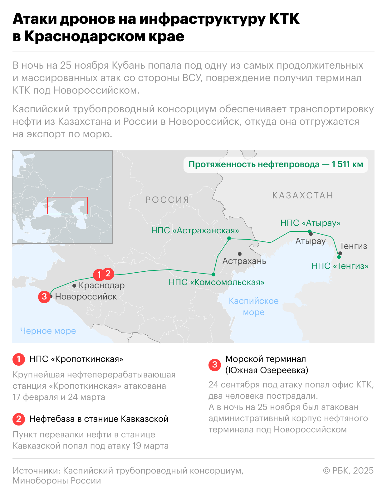 Дроны атаковали НПС «Кропоткинская» 17 февраля. Станция остановила работу. Пострадавших не было, работники предотвратили угрозу разлива нефти. КТК в тот же день предупредил, что прокачка нефти по системе идет на сниженных режимах, в обход поврежденной станции.