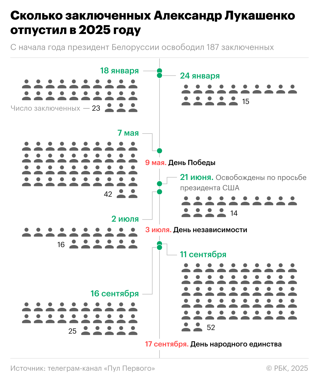 16 сентября офис президента Белоруссии сообщил, что в преддверии Дня народного единства Александр Лукашенко помиловал 25 человек — 13 женщин и 12 мужчин, «осужденных в том числе за преступления экстремистской направленности». «Все они признали вину и раскаялись в содеянном, взяли обязательство вести законопослушный образ жизни», — говорится в сообщении.