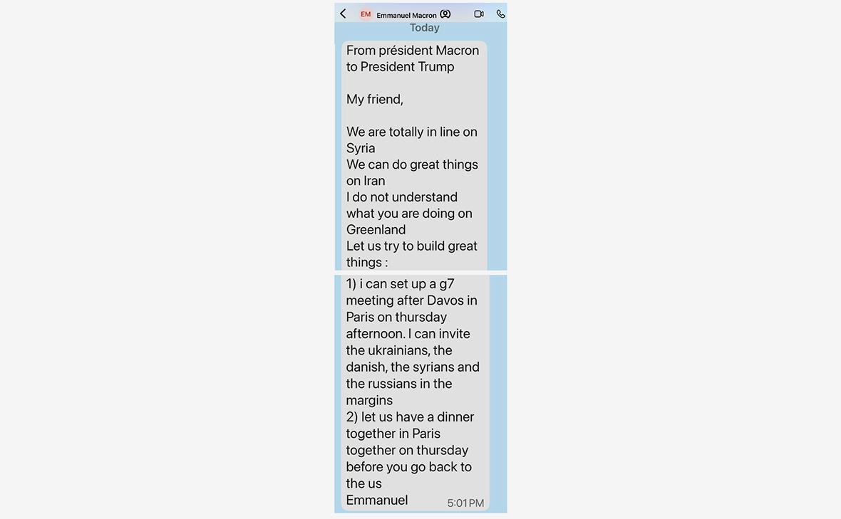Макрон в личном сообщении предложил Трампу устроить встречу G7 сразу после Давоса и пригласить на нее россиян. В опубликованном сообщении французский лидер также недоумевает из-за интереса главы Белого дома к Гренландии