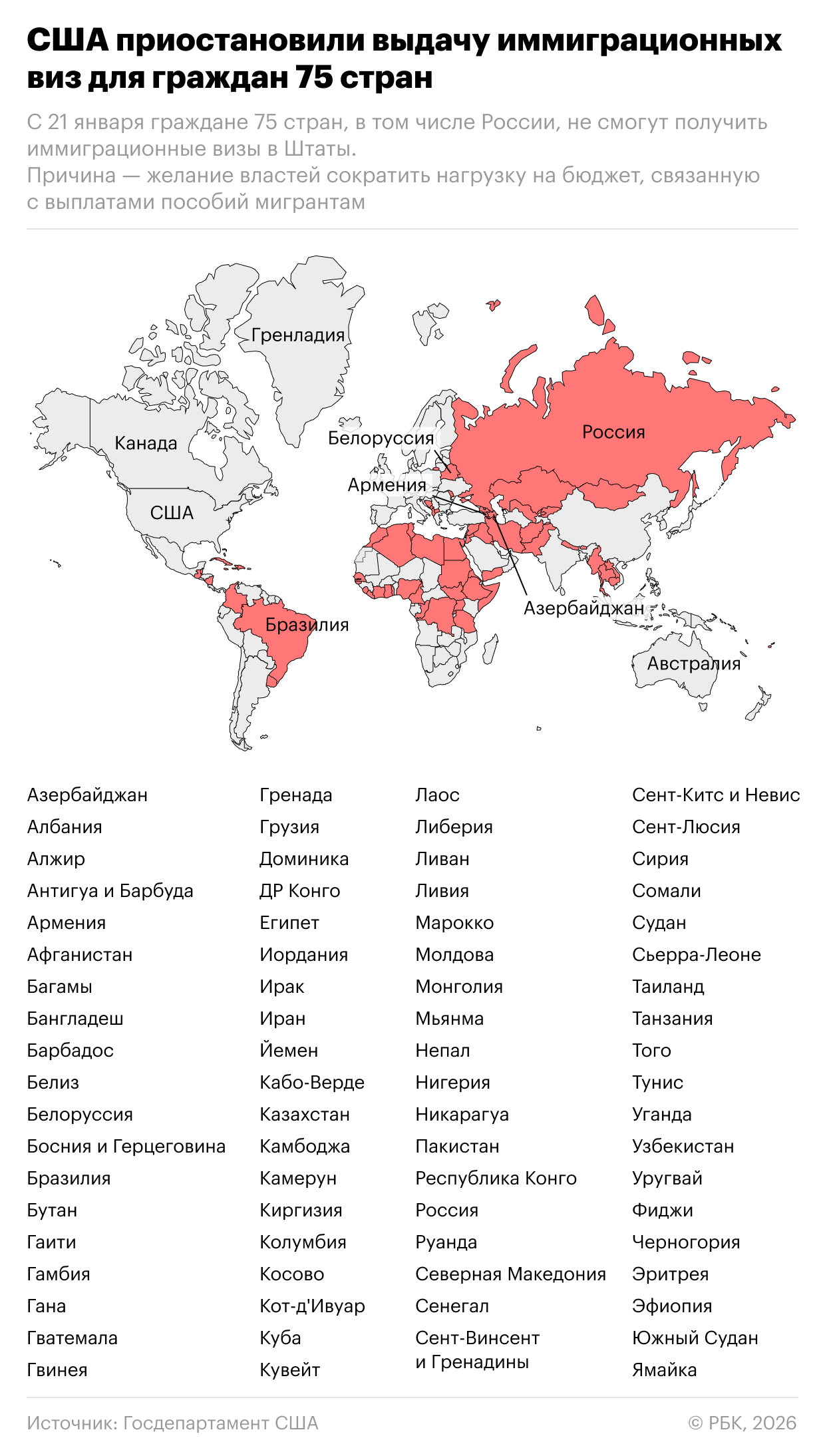 С 21 января Соединенные Штаты приостанавливают обработку заявок на получение иммиграционных виз для граждан 75 стран. Меры будут действовать неопределенный срок. Они распространяются в том числе на участниц СНГ — Россию, Азербайджан, Армению, Белоруссию, Казахстан, Киргизию, Молдавию и Узбекистан. Также мера коснется Грузии.