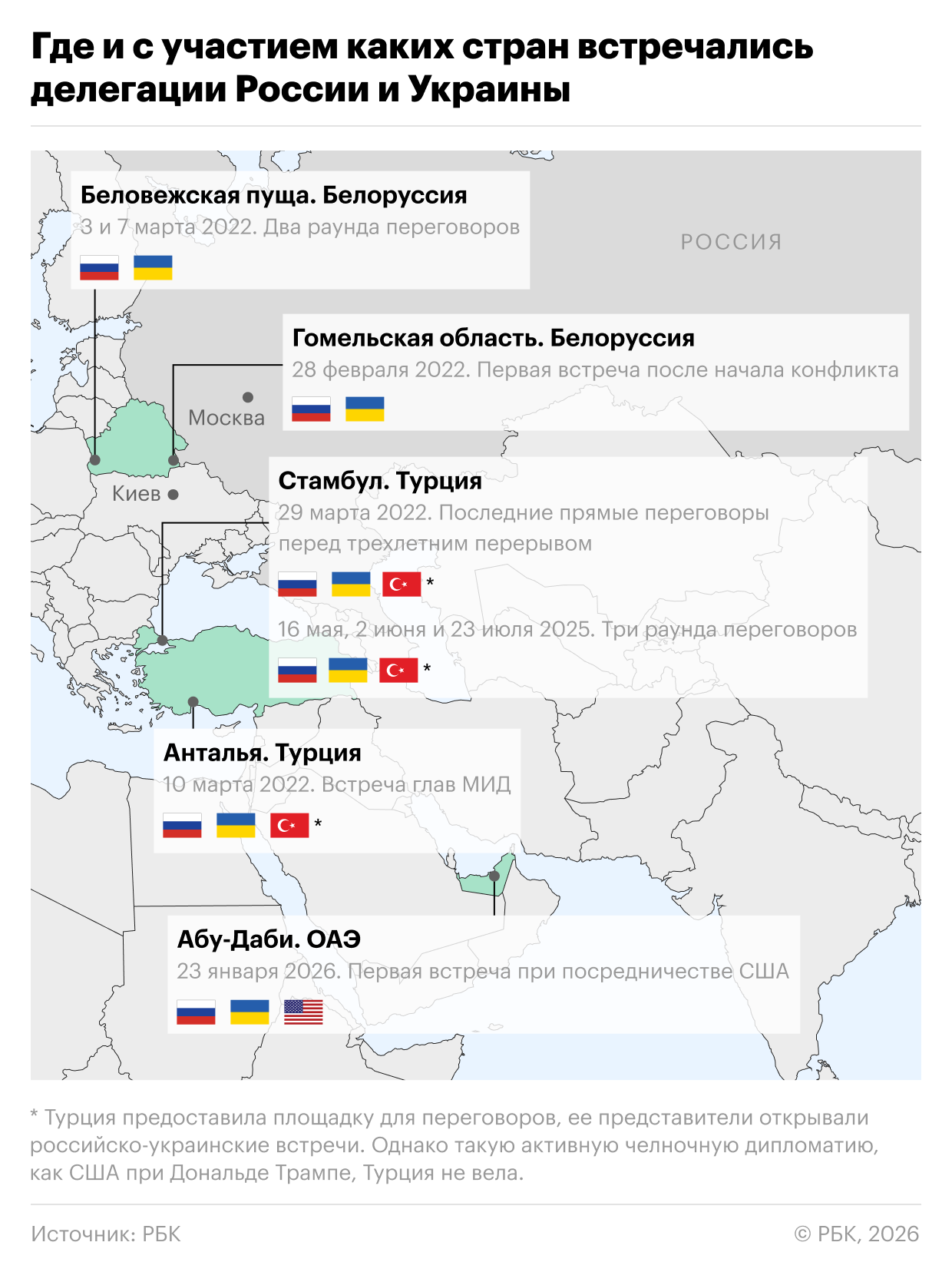 Россия, Украина и США впервые с начала военной операции проведут трехсторонние переговоры. Делегации встретятся в Абу-Даби. Где ранее проходили встречи представителей России и Украины и кто выступал посредником — в инфографике РБК