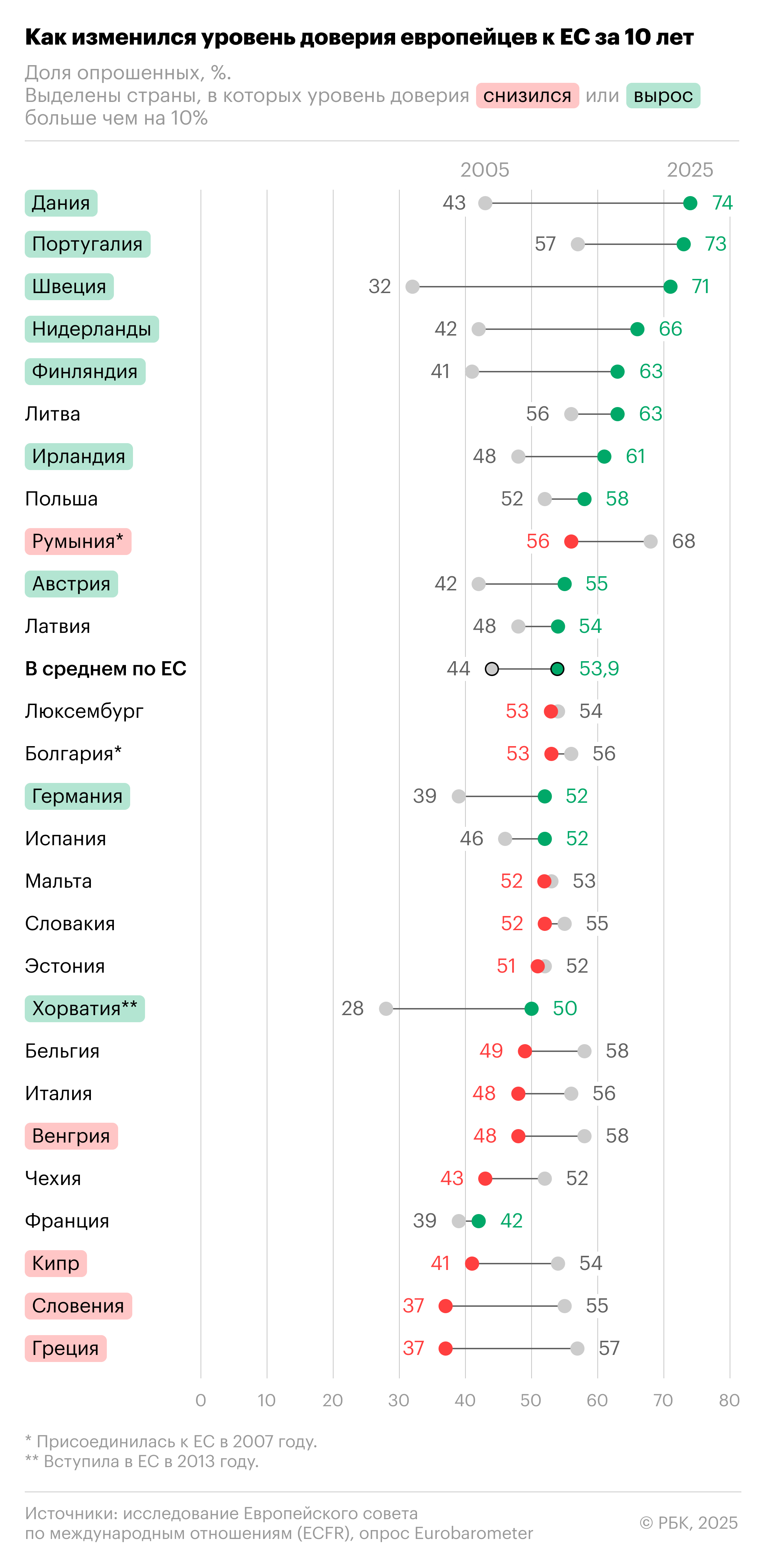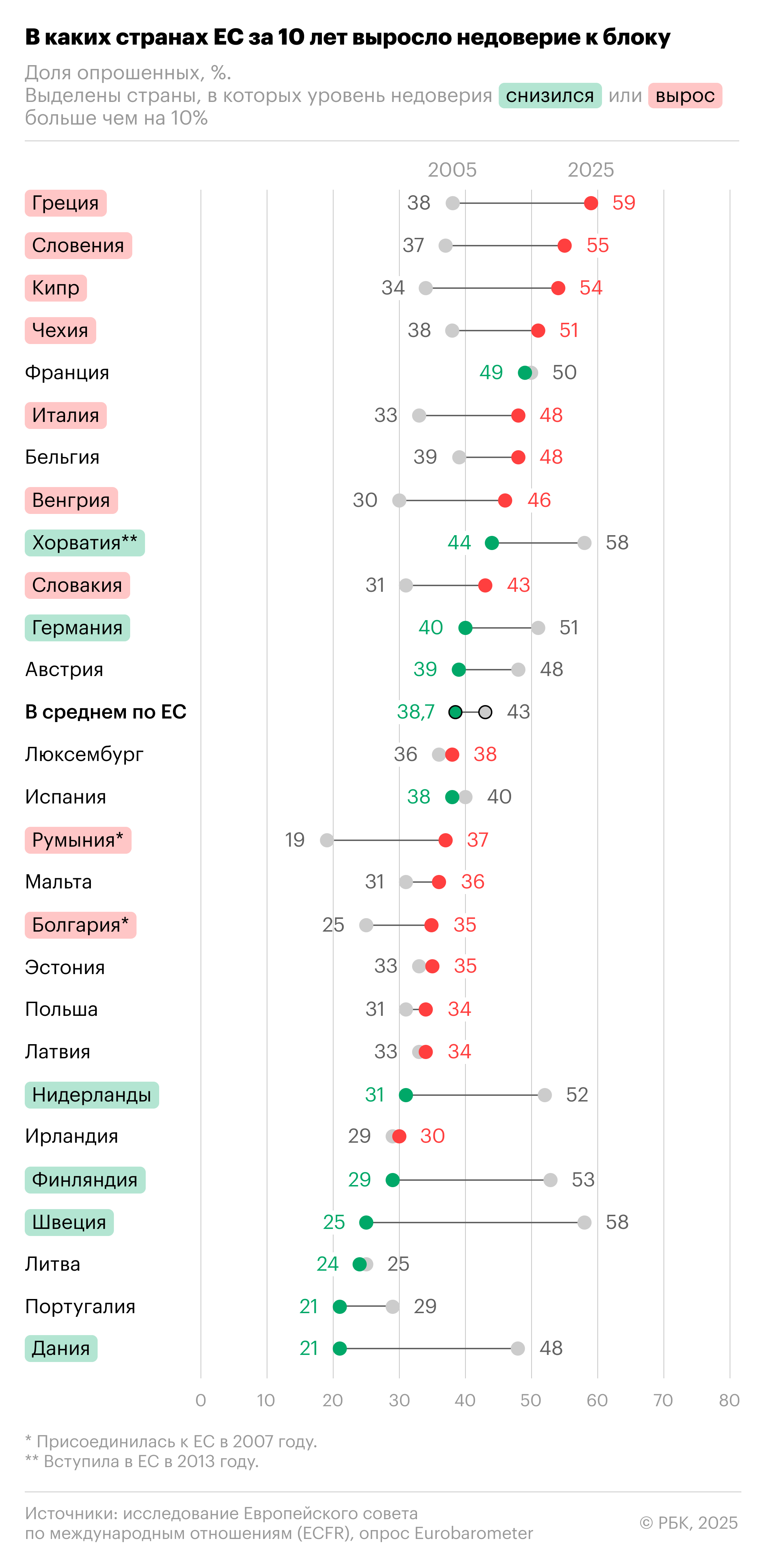 Большинство жителей стран ЕС (исключение — чехи, поляки и румыны) считают, что роль Европы в вопросе защиты от глобальных кризисов в области безопасности должна стать более явной. В то же время в некоторых странах блока уровень недоверия к ЕС остается высоким или даже существенно вырос за последние десять лет — особенно на Кипре (54% сейчас против 34% в 2005-м), в Чехии (вырос с 38% до 51%), Греции (поднялся до 59% с 38%) и Словении (с 37% до 55%).