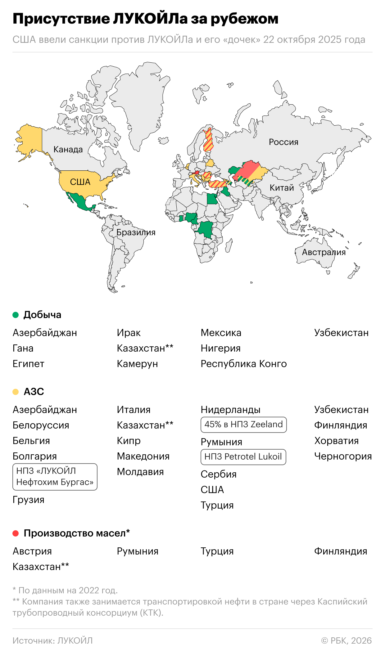 США ввели санкции против ЛУКОЙЛа и его дочерних предприятий 22 октября. Потенциальным покупателем был нефтетрейдер Gunvor, но вскоре он отозвал свое предложение после негативной реакции американского Минфина. Компания продолжает поиск покупателя.