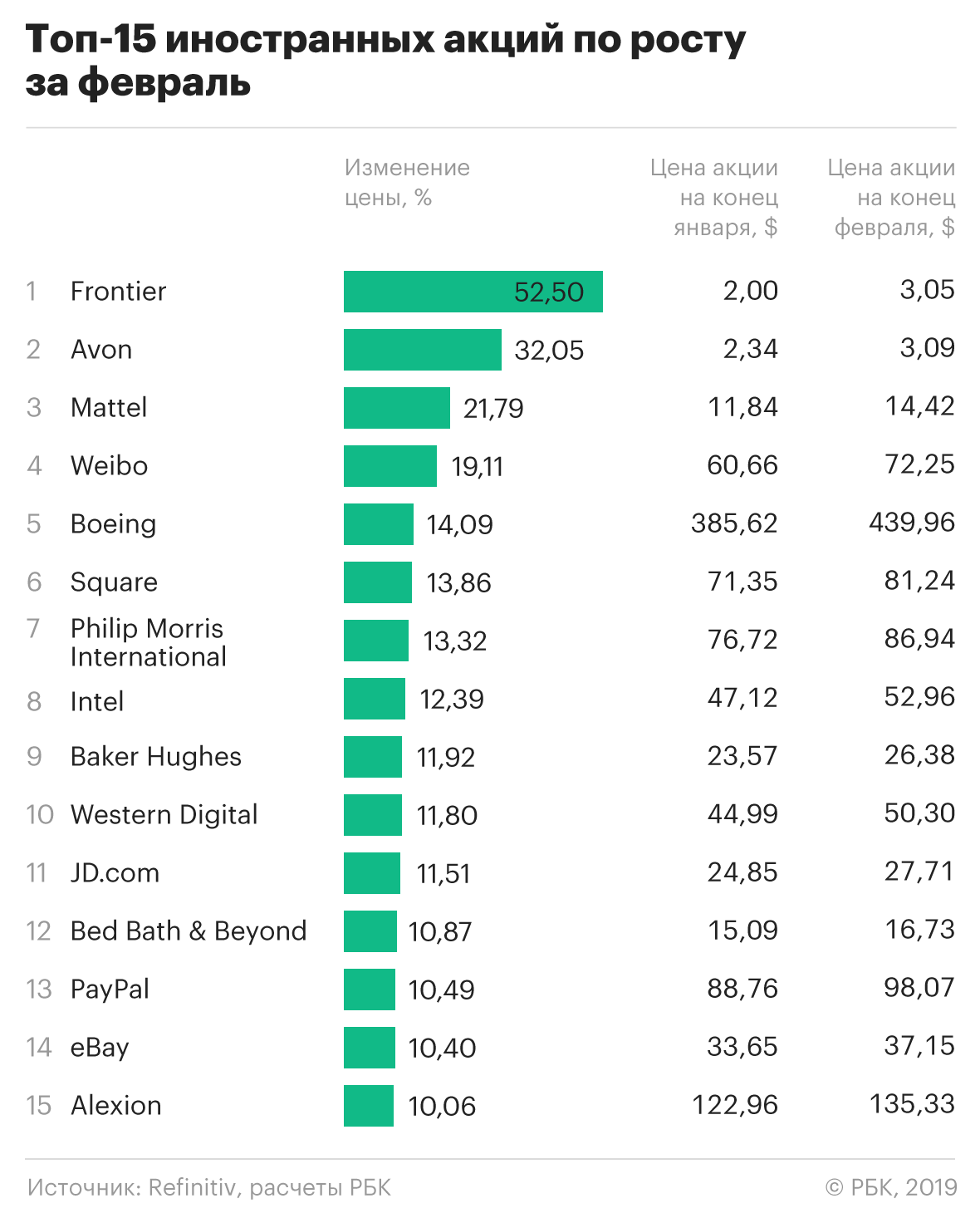 Иностранные акции тоже замедлили свой рост — с 33% в январе до 17,1% в феврале. Лидер рейтинга, Frontier Communications, смог выйти на первое место благодаря финансовой отчетности. Она оказалась гораздо лучше мрачных ожиданий инвесторов.