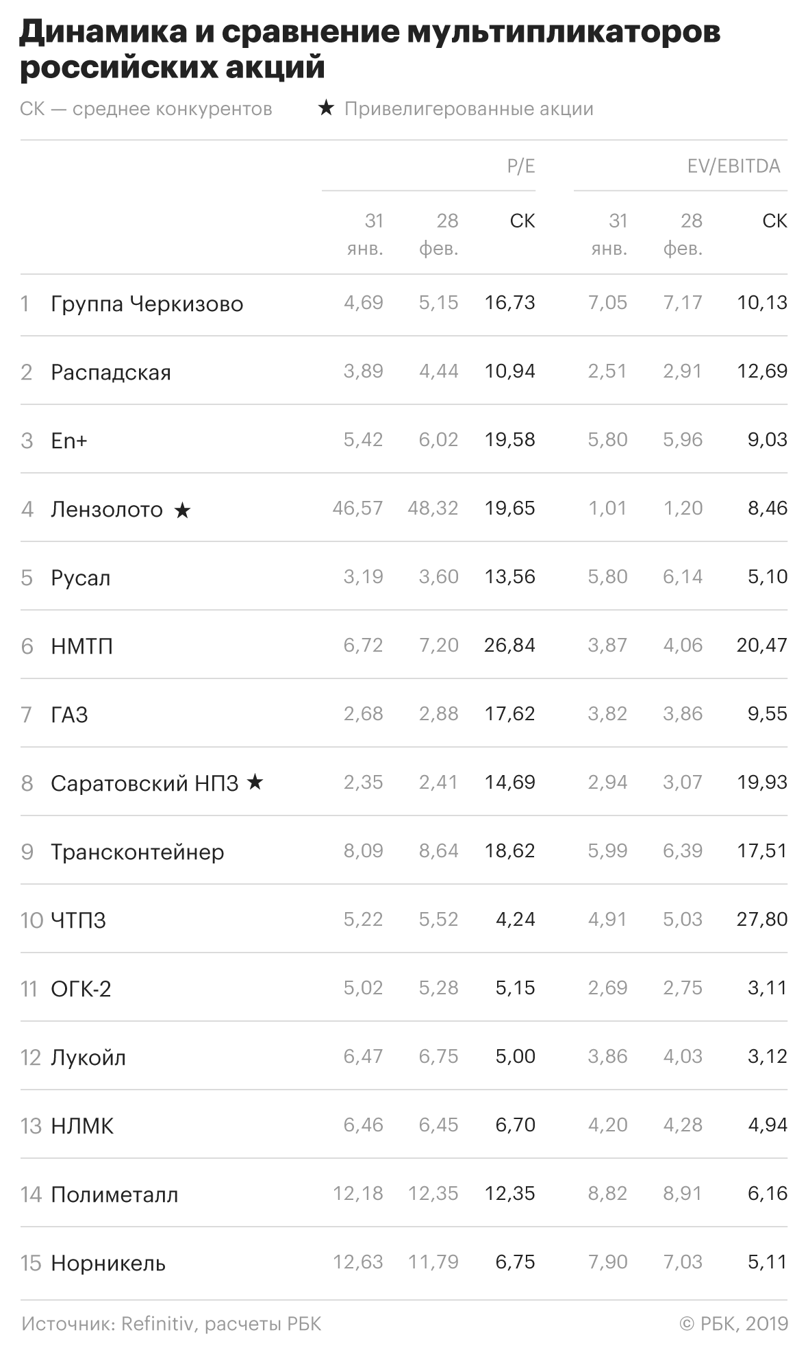 Как и в предыдущем месяце мы оценили, какие акции после роста котировок могли оказаться в зоне переоцененности. Для этого РБК Quote применяет сравнение мультипликаторов P/E и EV/EBITDA со средними значениями у компаний-конкурентов.