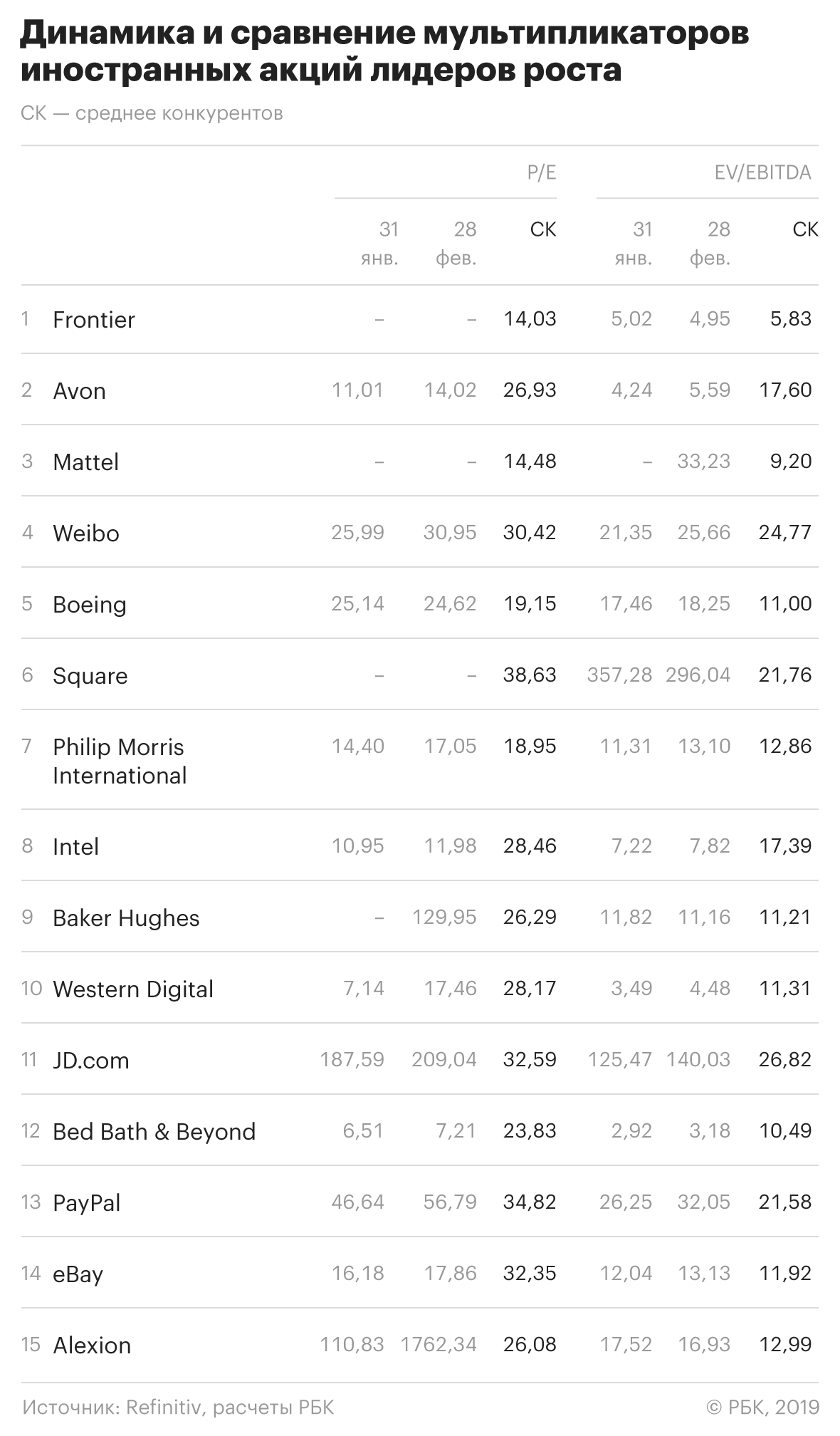 Среди зарубежных акций переоцененными можно назвать китайские интернет-гиганты Weibo, JD.com, а также американскую платежную систему PayPal. Их мультипликаторы после роста превысили значения мультипликаторов конкурентов. К переоцененным можно отнести бумаги Alexion. Их P/E многократно превышает значение этого мультипликатора у других фармацевтов.