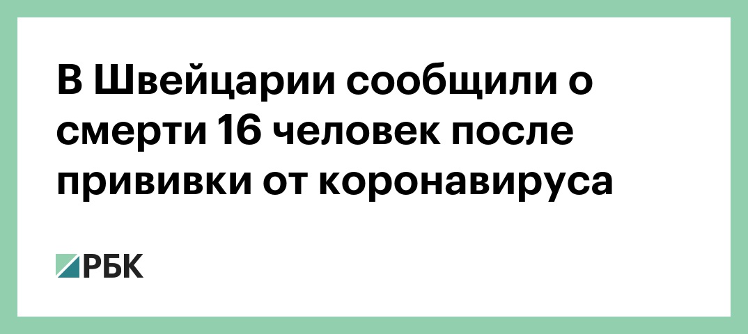 Швейцарский фармакологический институт (Swissmedic, национальный регулятор в сфере оборота лекарств) после начала вакцинации от коронавирусной инфекции получил 16 сообщений о смертях после прививок. Об этом регулятор сообщает на своем официальном сайте.
