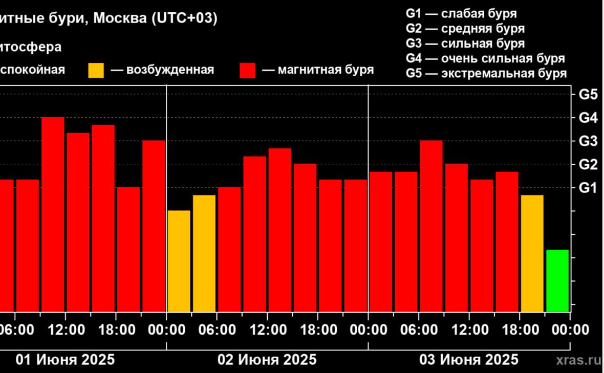 Из них шесть часов магнитосфера находилась просто в возбужденном состоянии. Утром 1 июня буря доходила до предпоследнего из пяти уровней — G4, который означает, что буря «очень сильная», хотя все еще не «экстремальная».