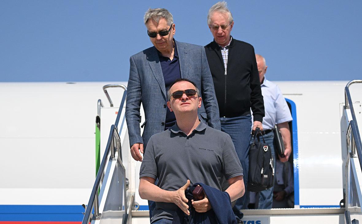 Владимир Мединский (на первом плане), Игорь Костюков (на втором плане), Михаил Галузин (на третьем плане) в аэропорту перед началом российско-украинских переговоров, Стамбул, Турция, 23 июля 2025 года (Фото: Рамиль Ситдиков / ТАСС)