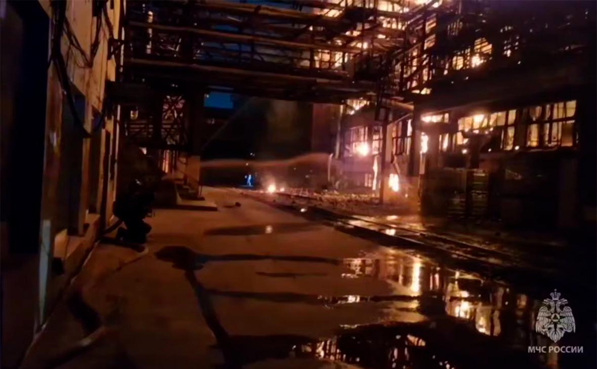 Площадь возгорания — 4,5 км, из-за пожара в здании обрушилась кровля. По предварительной информации, пострадавших нет. Причину возникновения пожара в ведомстве не уточнили.
