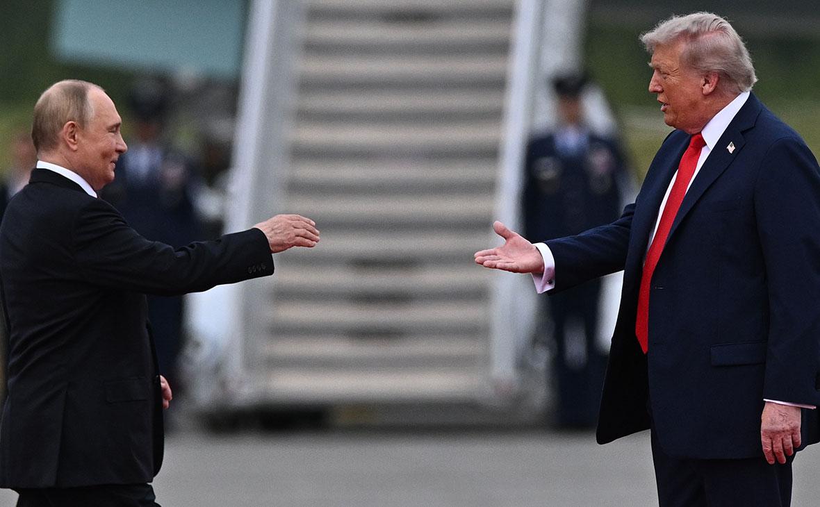 На снимке Трамп и Путин стоят на фоне самолетного трапа и протягивают друг другу руки для рукопожатия.