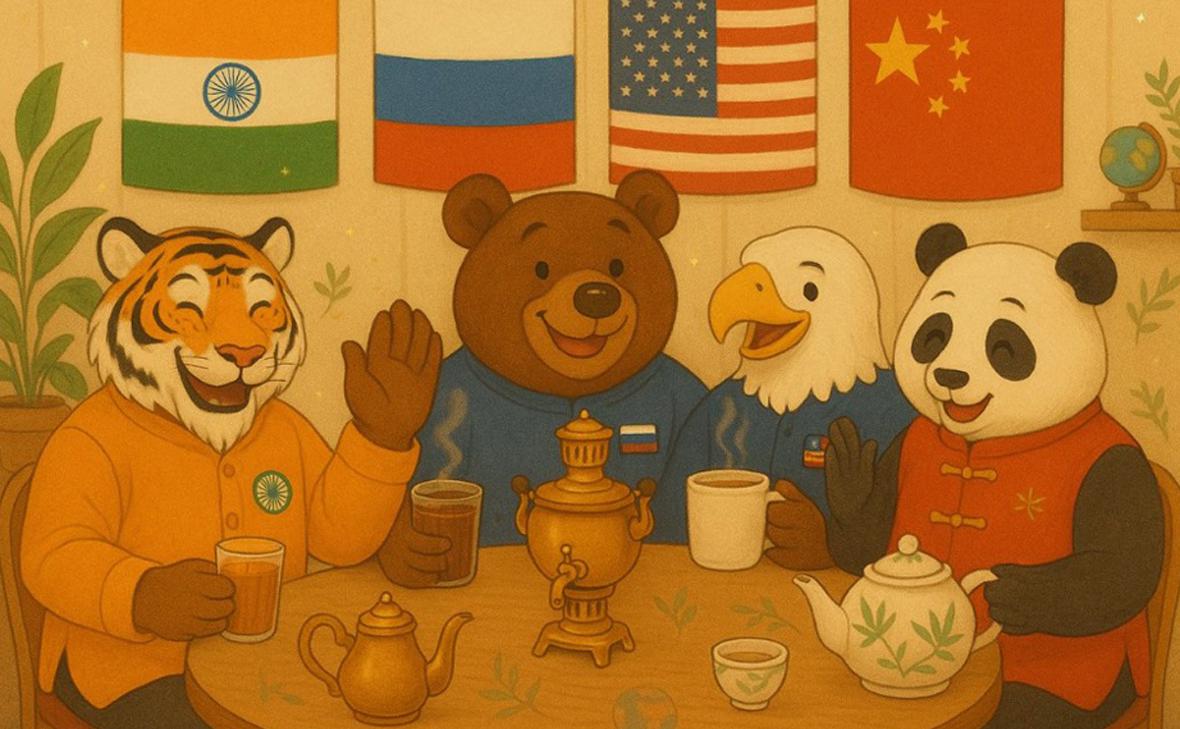 В первой версии изображения, которое он опубликовал в соцсети X 1 сентября, на картинке были изображены в стиле мультипликации Тигр, Медведь и Панда, сидящие за столом с чайными принадлежностями на фоне государственных флагов Индии, России и Китая.