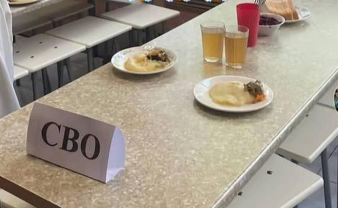 Таблички «СВО» и «Малоимущие» расставил сотрудник один раз «для удобства раздачи порций», сообщили RT в местном министерстве образования.