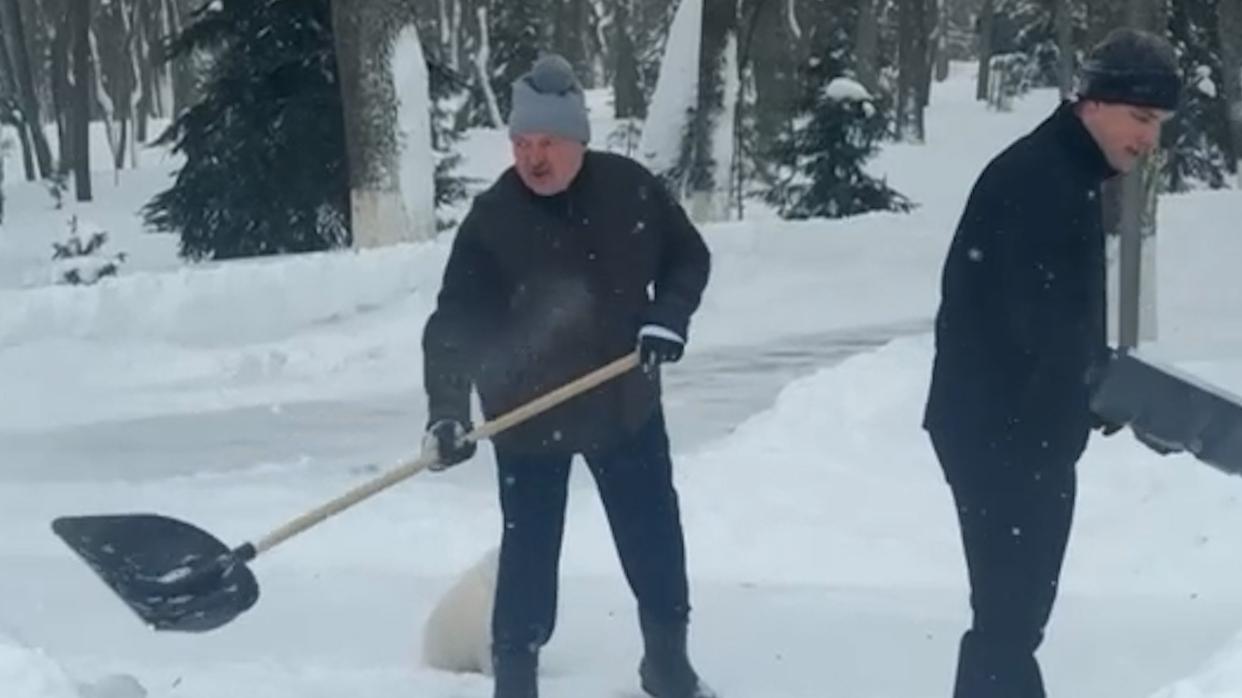 Президент Белоруссии Александр Лукашенко вместе со своим сыном Николаем и шпицем Умкой вышел на улицу убирать снег. Кадры опубликовал телеграм-канал «Пул Первого».