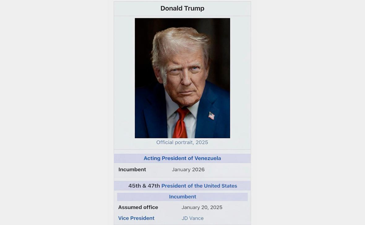 Изображение стилизовано под скриншот биографии Трампа в «Википедии». На нем, помимо поста 45-го и 47-го президентов США, у Трампа также указана должность исполняющего обязанности президента Венесуэлы с января 2026 года.