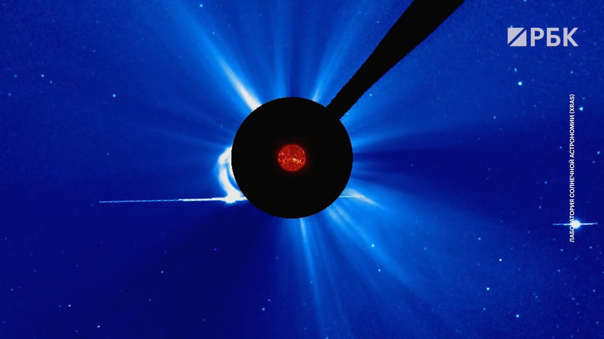 На снимках с коронографов запечатлено разлетающееся в разные стороны вещество. Рост излучения начался около полуночи по мск и в половине четвертого утра достиг уровня M3.3.