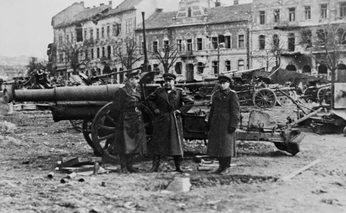 Маршал Советского Союза Семен Константинович Тимошенко (в центре), маршал авиации Григорий Алексеевич Ворожейкин (справа) и командующий артиллерией 3-го Украинского фронта Митрофан Иванович Неделин (слева) на разрушенной улице Будапешта, 1945 год (Будапешт, Венгрия) (Фото: РИА Новости)