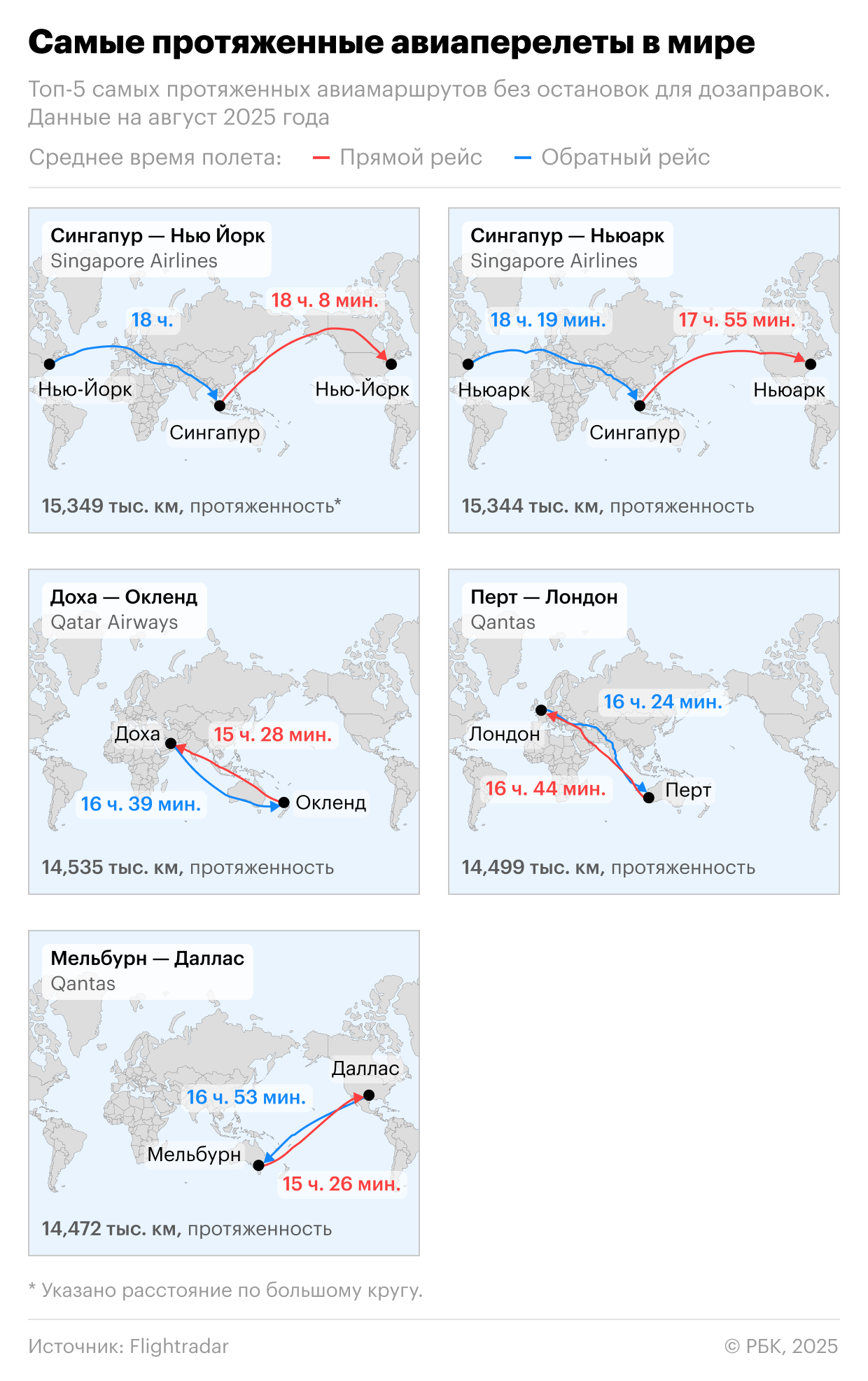 До сих пор самым длинным прямым рейсом считался рейс Singapore Airlines Чанги (Сингапур) — Нью-Йорк (США), который длится более 18 часов. В отличие от рейса Шанхай — Буэнос-Айрес, он совершается без посадок, преодолевая расстояние по большому кругу более 15,3 тыс. километров. Следом идет маршрут того же перевозчика в Ньюарк (США), который всего на 5 километров короче. Третье место занимала Qatar Airways с рейсом из Дохи (Катар) в Окленд (Новая Зеландия), а четвертое и пятое — австралийская Qantas (Перт — Лондон и Мельбурн — Даллас).