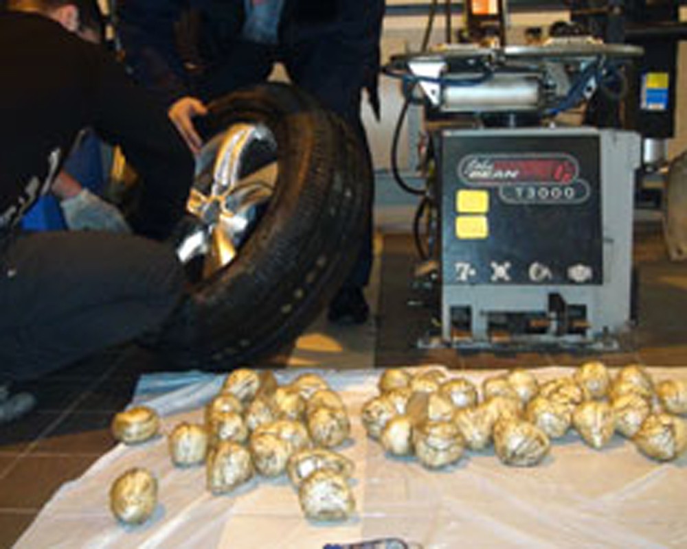 Для более тщательного досмотра автомобиль перевозчика был доставлен в специализированный автосервис. При вскрытии запасного колеса обнаружилось, что внутренняя полость шины до отказа наполнена свертками с героином. Общий вес партии наркотиков составил 30 кг.