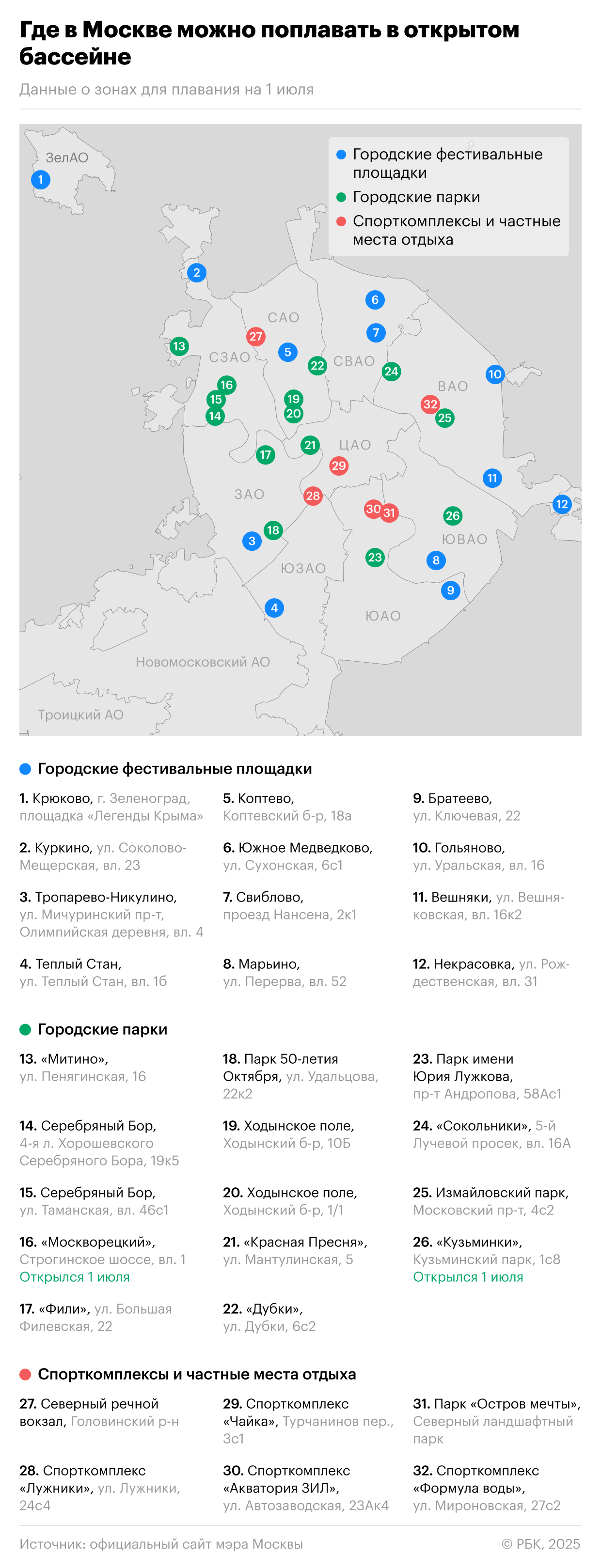 С 1 июня в столице работают 12 открытых бассейнов на фестивальных площадках, столько же — в парках и шесть — в спорткомплексах и частных местах отдыха. Найти ближайший к дому бассейн под открытым небом можно на инфографике РБК