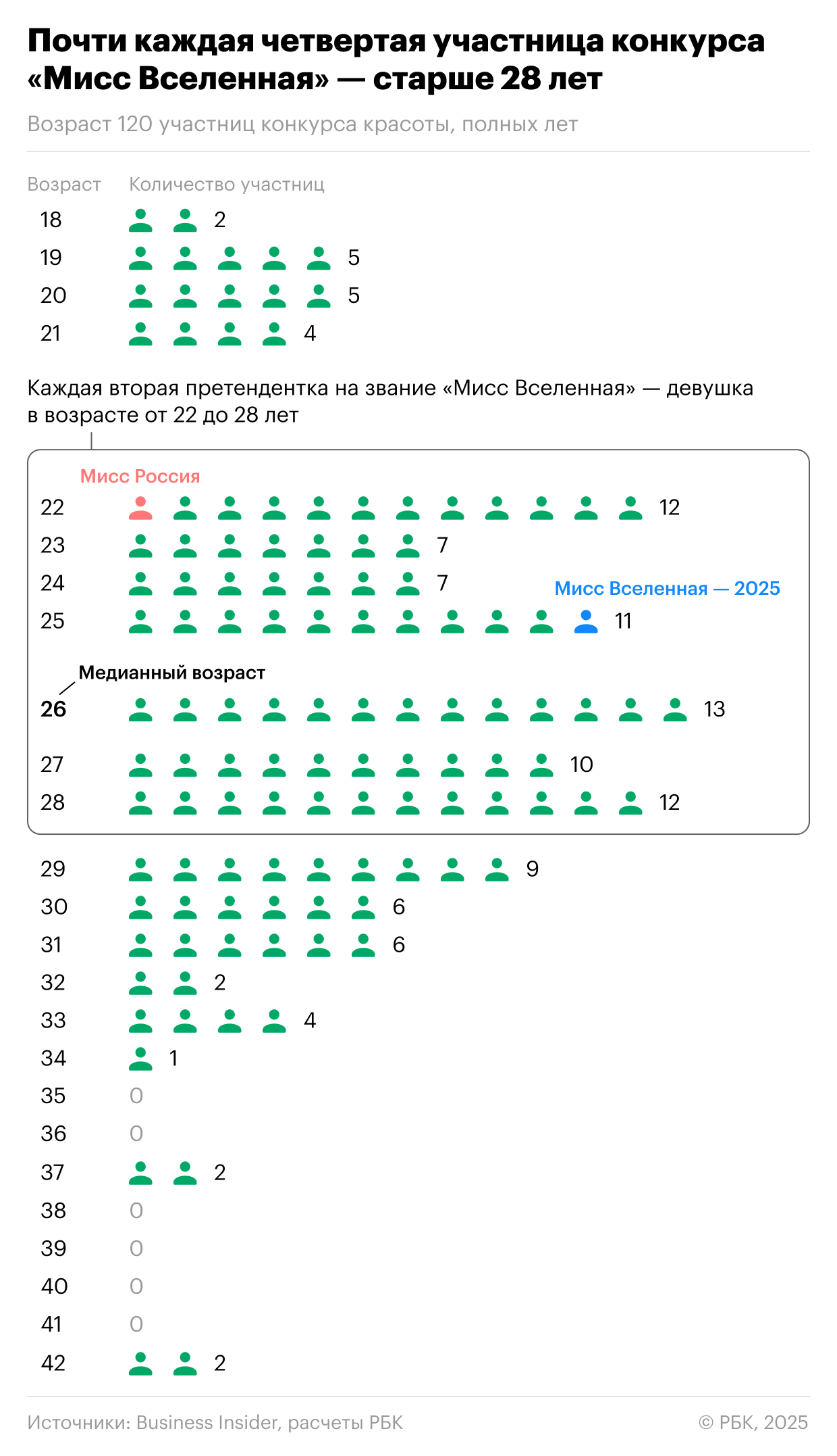 С 2024 года в конкурсе «Мисс Вселенная» отменены возрастные ограничения для совершеннолетних участниц — до этого за звание могли побороться только девушки с 18 до 28 лет. Два года спустя в списке 32 девушки старше этого порогового значения, то есть 26,7% от общего числа.